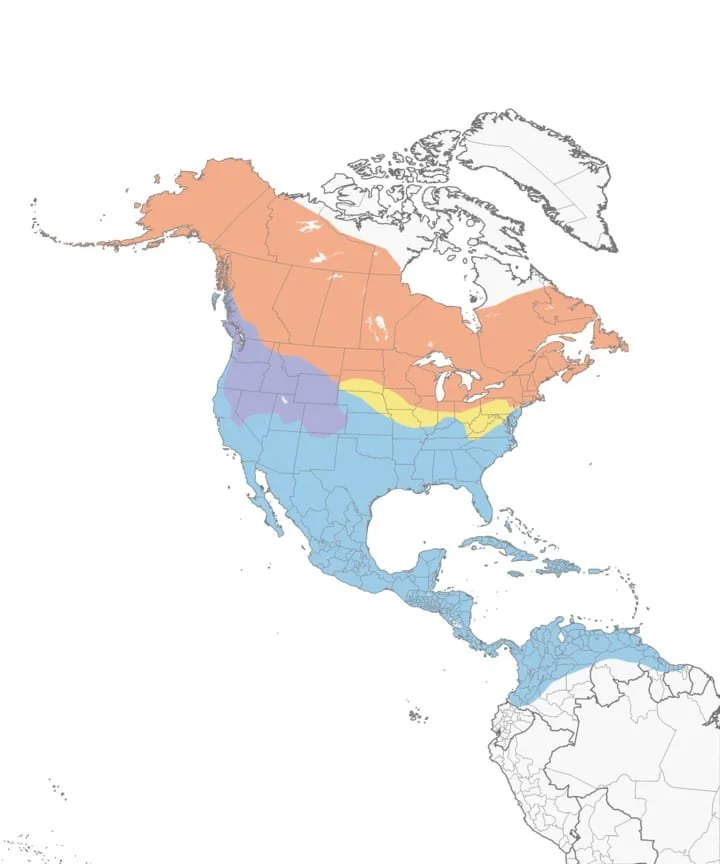 Range map : purple (year-round); blue (winter); yellow (migration); orange (breeding)